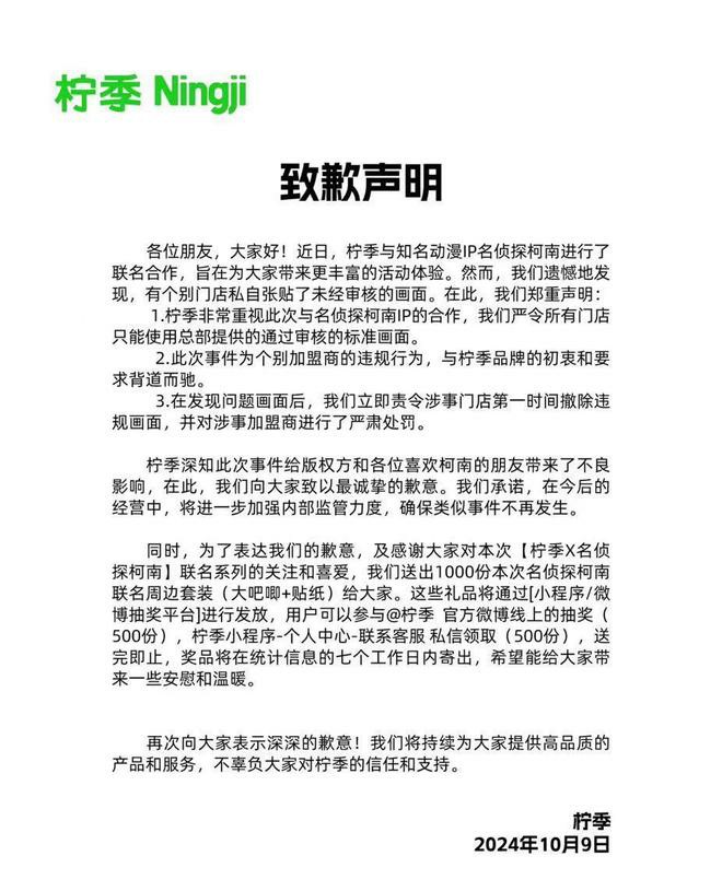 檸季表示,深知此次事件給版權(quán)方和各位喜歡柯南的朋友帶來了不良影響,在此,品牌方向大家致以最誠摯的歉意。檸季承諾,在今后的經(jīng)營中,將進(jìn)一步加強(qiáng)內(nèi)部監(jiān)管力度,確保類似事件不再發(fā)生。