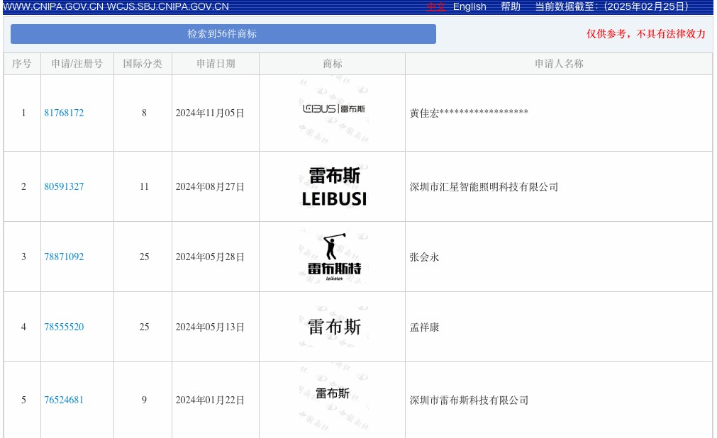 頂端新聞記者查詢國家知識產權局中國商標網了解到,截至2月25日,已有多個自然人及企業(yè)申請注冊“雷布斯”商標,國際分類涉及服裝鞋帽、教育娛樂等。