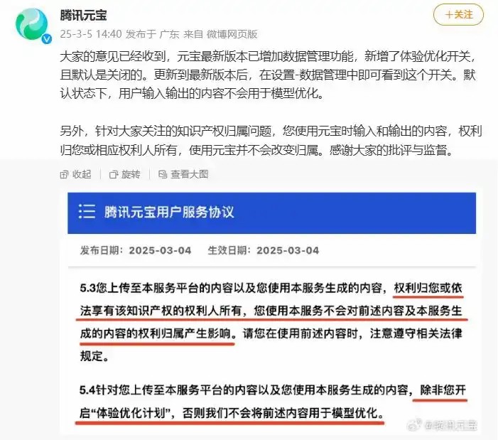 每經(jīng)快訊,3月5日,騰訊元寶微博發(fā)文稱,大家的意見已經(jīng)收到,元寶最新版本已增加數(shù)據(jù)管理功能,新增了體驗(yàn)優(yōu)化開關(guān),且默認(rèn)是關(guān)閉的。更新到最新版本后,在設(shè)置-數(shù)據(jù)管理中即可看到這個(gè)開關(guān)。默認(rèn)狀態(tài)下,用戶輸入輸出的內(nèi)容不會(huì)用于模型優(yōu)化。另外,針對大家關(guān)注的知識(shí)產(chǎn)權(quán)歸屬問題,您使用元寶時(shí)輸入和輸出的內(nèi)容,權(quán)利歸您或相應(yīng)權(quán)利人所有,使用元寶并不會(huì)改變歸屬。感謝大家的批評與監(jiān)督。